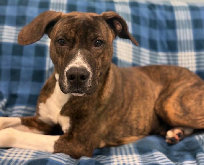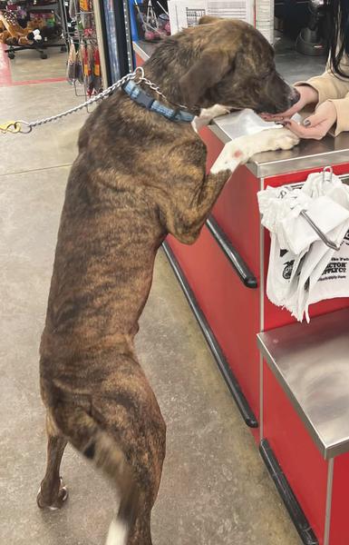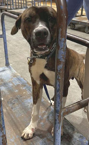 Damien is wary of people at first due to never being socialized and growing up in filth. He was brave and he met lots of new friends who fed him his new found favorite treat, HOTDOGS. We cannot thank the employees of our local TSC enough for always being so kind and patient with our timid pups and showing them that not all people are scary. Damien is estimated to be around 3 years old and weighs 60 lbs. He is neutered and up to date on his vaccines. We believe he is a Bully/Boxer mix. He does well with dogs, and according to a short term foster, he absolutely adores cats. He will need some work on crate/house training, his leash manners are pretty good, and he is highly food motivated and loves to learn. He is a total sweetheart and gets excited very easily! He loves to run, but does not stray far from his human.